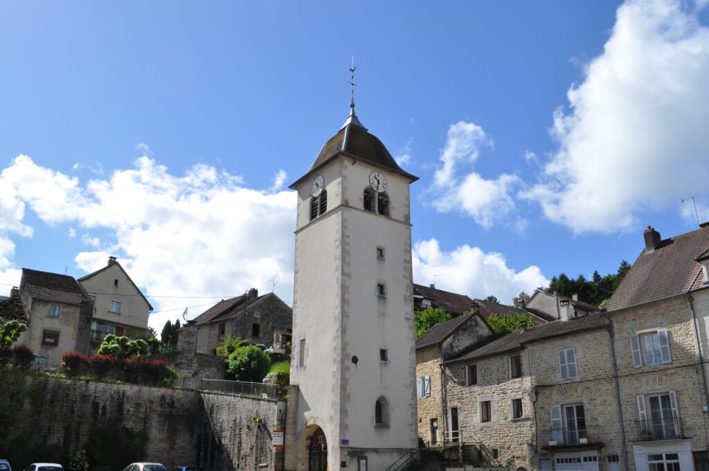 Le beffroi a une histoire insolite. Avant que la Cité ne devienne paroisse (1585), le bourg-dessus relève de l’église de Toulouse-le-Château et le bourg-dessous de l’église de Vers. Depuis le bas Moyen Âge, les offices religieux ont lieu dans la chapelle Notre-Dame, démolie vers 1780 à l’exception de son clocher. Couvert d’une toiture comtoise, il témoigne toujours du grand projet de reconstruction ajourné par la Révolution Française.