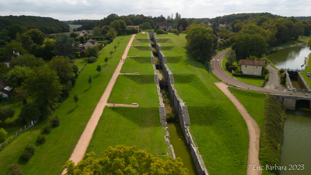 Mais ce qui attire toute l’attention, c’est le Monument historique des 7 écluses, faisant partie d’un gigantesque projet conçu par Henri IV et Sully dès 1597, pour unir la Méditerranée à l’Océan et à la Manche au moyen de canaux reliant les rivières. Pour cela il fallait unir la Loire à la Seine et donc franchir le seuil séparant les deux bassins. Pour la descente à pic de 24 mètres sur la Vallée du Loing (coté Rogny les Sept Écluses), est imaginé cet ensemble de six écluses accolées plus tard par une septième.